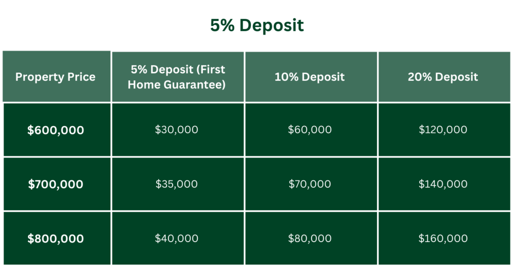 - The difference between 5% (via the First Home Buyers Scheme), 10% and 20% deposits